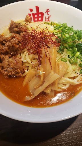 Read more平日のお昼にお邪魔しました。油そばはあまり食べたことがなくこちらのお店で2回目でございます。 最初に食券を買ってお店の方に渡すスタイルです。メニューに説明は書いてありますが、初見だと理解するのに時間かかりそうです。 店内は清潔感があり、女性の店員さん3人が元気でとても感じが良かったです。 油そばは、普通、大盛、ダブルが選べ、値段が同じととてもお得でした。女性でもダブルを選んでいましたが、今回はランチの定食にしたので、ライスと餃子がついていたので、大盛りにしました。 熱々の麺にラー油と酢をかけて混ぜていただきました。油がくどくなくあっさり食べれました。 少し硬めなご飯が私の好みと油そばに合い、とても美味しくいただきました。 餃子も具沢山でボリュームがあったので、こちらも満足でした。 平日だからか来店者が少なかったのが、こんなに美味しいのに疑問でした。 バイパスから入りにくいのと目立たないからかもしれませんが、ぜひ、食べてみてください。...