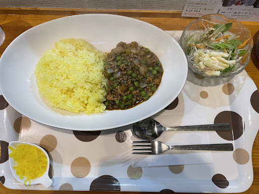 10分程度で出来上がりました。 キーマは当然ながら挽肉たっぷりで程よい辛みがあります。また、キツい香辛料の香りも余りなく、私の好みの味付けです。 サフランライスなのかターメリックライスなのか不明ですが、ちょっと硬めに炊かれたご飯にキーマカレーは抜群に合います。 サラダはマカロニサラダと千キャベツが入っていて、とても食べやすいです。