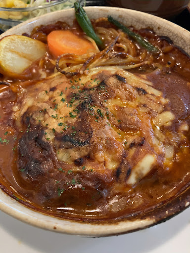 ライス、サラダ、味噌汁、 小鉢、漬物、ドリンク付。 ドリンクは食後に。 ソースは甘めの濃いめの ミートソース味。 子供も好きそうな味で ご飯が進む。 肉とソースが合っている。 量は普通。