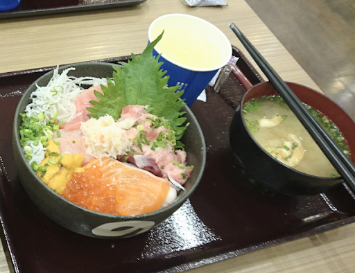 味噌汁は、普通に海鮮丼に付いてきてビックリ、白だしが効いていて、具にネギ、ワカメ、油揚げが入ってホッとする味を海鮮丼と一緒に楽しめるのは、とってもイイと思いました。