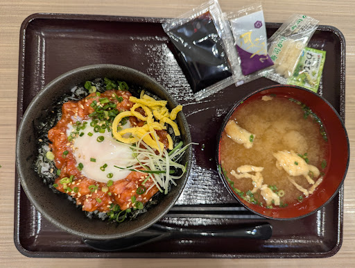 まぐろユッケ丼は、ご飯、海苔、錦糸卵、ネギ、細切りのきゅうり、鮪の叩き、ユッケダレ、温泉卵が1杯の丼ぶりに詰まっており、種類が豊富で食べ応えがあり、たっぷりの鮪の叩きは、口当たりがよく、ユッケダレは、醤油やごま油の風味の中に感じるコチュジャンのピリッとした辛みと食欲を唆るニンニクが、鮪の叩きとの相性も抜群で、温玉を混ぜると、全体がまろやかになり、ご飯がモ...