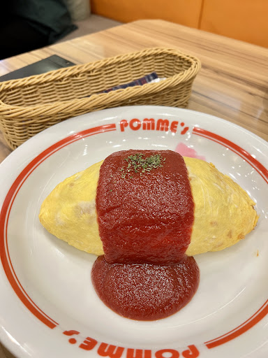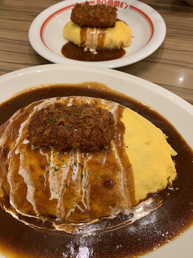 ポム豚かつのカレーソースオムライスSSは、バターライスを包む玉子の上に、豚カツがドーンとのり、カレーソースが全体にかかって、食欲が刺激され、パセリで彩りを添えたオムライスは、豚カツがのり、肉厚で食べ応えがある上に、バターの風味が、まろやかな玉子と合っていて、カレーと豚カツの相性もよく、豪華なオムライスを堪能できました。