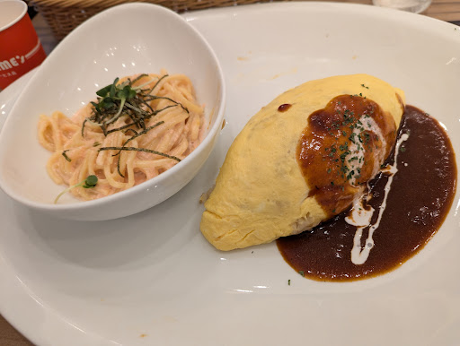 様々なオムライスを扱う「ポムの樹」は、ずっと食べてみたーい!!と思っていて、スタンダードな包み方のオムライスに、ケチャップ、デミグラスソース、ハヤシソース、トマトソース、クリームソース、カレーソース、ちょっと和風、その他に、創作や期間限定まであって、バリエーションが豊かで、メニューを選ぶだけでも、あれこれと迷ってしまいました。