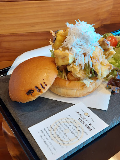 注文はもちろん「やまにばーがー」。 桜が練り込まれた小うどんとセットで1350円です(^^) サンドされるのはかき揚げ天ぷらで、地元の野菜がゴロゴロと、他にも海老、蟹、しらす、などなどボリュームたっぷり、美味しくて食べごたえのあるバーガーです♪ バンズのふわっと感と、かき揚げのカリッと感が良い調和の食感。 ナイフとフォークが用意されていますが、バーガー袋に入れてかぶりつかなきゃ!ですよね~ 意外と食べやすいです。かき揚げなので想像していたよりポロポロと散らかったりしませんよ。