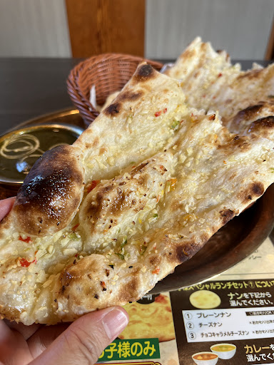 ナンは表面にバターが塗ってあり、そのままでも美味しく頂けます。また差額を払えば最初の1枚を別のナンに変更できます。(おかわりナンはプレーンのみです。)ちなみにチーズナンはピザって感じです(笑) プレーンナンの大きさですが、底辺25cm×高さ40cmくらいの二等辺三角形ですが、薄焼きになっていると長さが+10cmくらいの時もあります。チーズナンなど一部のナンは丸型です。(やはりピザ・・・w)