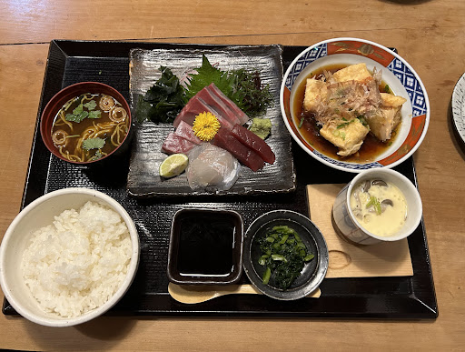 10分ほどで料理が出てきた。 刺身盛り合わせに平目のから揚げ、茶碗蒸し。