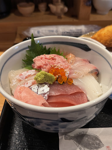 おまかせ丼は頼むとして、アジフライもめちゃくちゃ気になっていたので単品注文。大きいので半分にしときなと言われたので従いました。アジフライが来た瞬間、これはビールだ!とビールも追加注文。ここのビアサーバー、よく洗浄されているのか注ぎ方がうまいのか非常に良い感じでビールがうまい。 冷めないうちに先にアジフライを頂いちゃいます。結構しっかりした量で、タルタルソースも豊富についてきて何で食べるか迷います。アジフライはソースもいいけど、鮮度いいやつは醤油派なので一度はこれで食べてほしい。ここのは衣が非常に軽くて、サクサク、中のアジはふわふわの最高の仕上がり。そして、追っかけで飲むビールのうまいことうまいこと。アジフライセットとビールでも優勝間違いなしです。 冷静になったところで丼へ。 おまかせ丼(1180円)は冷奴にエビの味噌汁がついてて良い感じ。刺し身も5種類くらい(マグロ、イカ、アジ、鯛、いくら、イナダ?ブリ?あたり?)が乗っていてどれも鮮度よく非常に美味しい。ちなみに酢飯か白飯か選べますが、これは酢飯がオススメな感じ。 初日から非常に良い昼食を頂きました。海鮮丼にアジフライ(多分400円弱)つけて、ビールまで飲んで2000円ちょいとかバグか?というくらいのコスパの良さでした。