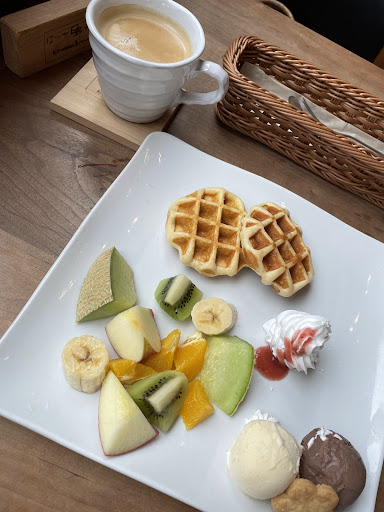 ホールには2人のスタッフしかおらず、全く客に気配りが出来ていない感じ。 いざ食べようと思ったら、割り箸とスプーンしか無い💦 ワッフルやカットフルーツを割り箸で食べろと言うのか。 もちろん気付いていない様なので、すみませーん!と言うと、あ!と気付いたみたいで、フォークとナイフをカチャカチャと用意をしてる感じ… いやいや、その前に「はい!ただ今お伺いします」とか何か一言無いのか? ワッフルもパサパサ、添えられてる生クリームも激甘…
