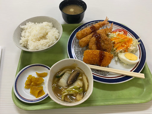 メニューはなかなか豊富。 めちゃ安い!ということはなく、まあ普通のお値段。 せっかくだし、試験場ランチという名のメニューをチョイス。800円ほど。 イカフライ、エビフライ2本、カツ。 あと、八宝菜と味噌汁。 揚げ物はアツアツ!特にカツは柔らかいお肉がサクサクの衣に包まれて美味しー! エビフライも小さいけどエビの甘味が口に広がる! だがイカフライ。お前はダメだ。冷凍食品そのまま。