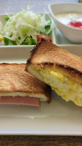Read moreお庭の雰囲気が凄く良いお店です。 モーニングのアイスコーヒーセットメニューに+60円です。コーヒーは苦味が強く、ストロングタイプかも。あっさりしたアイスコーヒーが好きな人には苦手かもしれません。 ホットサンドサクサクで、美味しかったです。たまごと、ハムチーズの2種類がセットなっています。 果物も甘くて美味しかった。庭を見れる席がおすすめです(^^) テーブルメニューにはありませんでしたが、店に入ってすぐにシフォンケーキもあり、注文でき、プレーン450円、黒...