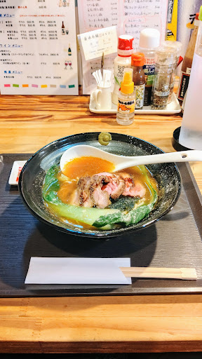 鴨を使ってるからちとお値段は張ります。 でも使っているのはツムラ本店の河内鴨なので間違いはありません。 鴨が海苔の上にたっぷり♪ それに柔らかい青梗菜🥬 柚子胡椒と七味で味変する感じです。 麺は中細でスープがよく吸い付きます。 でもやっぱり鴨の香りが素晴らしい。 そして絶妙な弾力とそこから溢れる🦆🦆した鴨の味。 スープにも染み出して最高です。 替え玉するまでもなくスープをズズズっと啜ってしまう美味しさ。 文句無しです。