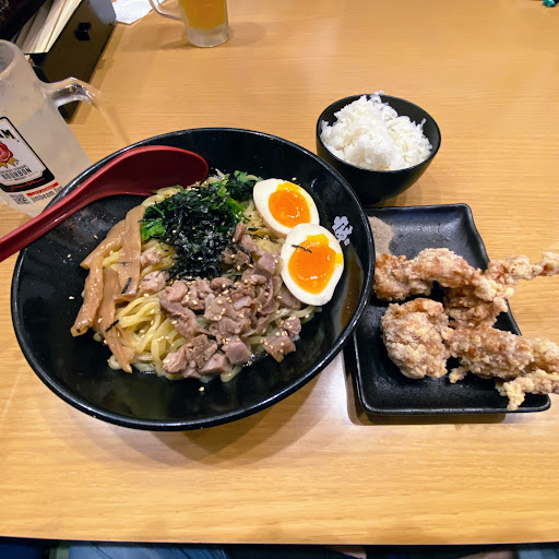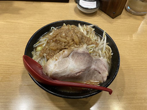 店はよく掃除もされておりとても清潔感があります。 夜遅くだったので注文してから5分ほどで運ばれてきました。 見た感じ、これこそ二郎系というビジュアルです。 スープをひと口啜ると二郎系ならではのガッツリ効いた豚骨のいくらでも水が必要になるほどの濃い味です。 具材は二郎系王道の味噌?が上に載っているもやしとチャーシューのみ・・・ 漢です(笑) 麺は二郎系ならではの4~5mmほどの幅の平打ち麺で、若干の硬め。 今回食して再認識したことは、二郎系は腹を満たすためのラーメンであって楽しむものではないということですね・・・ たしかに美味しかったのは間違いないですが、夜中に胸焼けで目が覚めたのは言うまでもありません(+o+) このラーメンの星は...