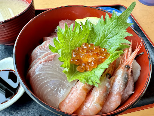 ご飯は酢めしではなく白米。オオバや刻み海苔がご飯とネタとの間に敷かれることで、ご飯の熱でネタに火が通ることは避けられている。ネタはどれも新鮮でした。まぐろは中トロぐらいの切り身が三切れ、ぷりぷりのカンパチも三切れ、イカはもちもちで二切れ、小ぶりではあるが上品な甘さのホタテは二粒、殻付きの甘エビは三匹、そして真ん中にイクラが乗ります。味噌汁と漬物が付き、うずらの卵をネタの上に割り広げて頂きます。