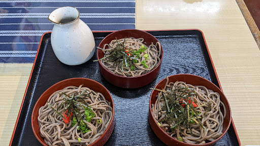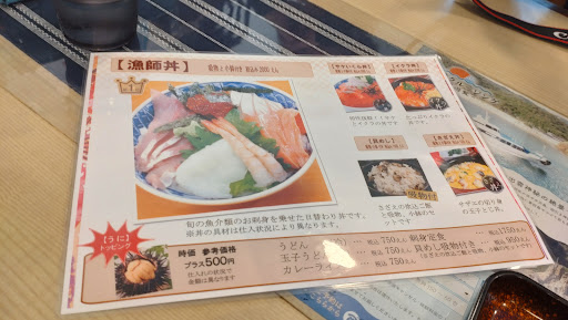 場所柄、各種海鮮丼が主なメニューです。 あまりたくさんは食べられそうになかったので、山かけ丼と吸い物のセットと割子蕎麦を注文しました。 メニューの写真ではご飯が見えないほどのお刺身が乗っているものでしたが、実際は2種類(そのうち一種類はサーモン)の刺身が数切れ乗っているだけ。切り方も不揃いでした。 注文間違えたかとメニュー見直しました。 割子蕎麦はもみじおろしが付いていたのですが、味も香りも全くしない薬味でした...