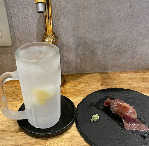 驚いたのが、クチコミにも書いてあるとおり突き出しに肉寿司が出ます。 いきなり「シメ…?」と思いましたがバーナーで炙っており、お肉は美味しいですがやはりコストの面でシャリはイマイチ…。