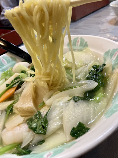 そして注文して五目野菜麺は、 透き通った海鮮系の優しいスープですが、 遠見も強く無く、 とてもレベルの高いスープです♡ 野菜もシャキシャキで、 ストレート麺の茹で加減も、 やや硬めで、 優しいスープに絡んで箸が止まりません❤️