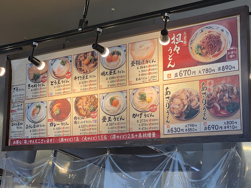 Read more安くて早くて美味しい♪いつもの定番に加えてCMでやっている期間限定メニューが季節感あって楽しみです。限定メニューは必ず道沿いにのぼりが出るのでそれでチェックして来店すると良いですよ☆ 今はうどん一杯で一枚『うどん札』がもらえ、集めてクーポンとして使えます。(下記参照) ●三枚…トッピング1つ無料 ●五枚…天ぷら100円引き ●10枚…うどん並 一杯無料 うどんの他、丼が少しありましたが最近メニューが増えて注文するカウンター少し手前の角に丼注文用の札が並べて掛けてあります。それを取って注文するようです。 限定メニューの具(甘辛い肉など)によっては注文してからレジ手前で一つづつ調理してのせてくれるので出来たてで美味しいです。レジ手前に天ぷらと並んで小さめオニギリも有り。 平日昼12時から1時半くらいはとても混んでいます。土日は遅い昼の人もいるので午後2時くらいまでは混みます。 毎月1日は釜揚げが安い日なので普段より混んでいる気がします。 大きいテーブルの座敷席もあり、子供用連れも多いです。子供にはレジで棒付きキャンディプレゼント♪子供用に取り分けるお椀や子供用フォークも有り。 駐車場は隣のローソンと並んであります。道から見て駐車場一杯に見えても入った奥にまだあるのであきらめず入ってみて。土日など混んでいる時には警備員さん...