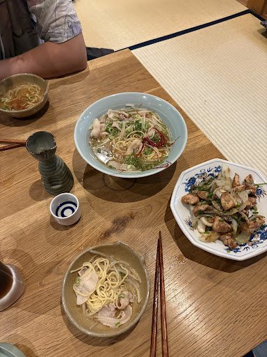 Read more突き出しのポテトサラダとシーザーサラダに自家製のベーコンがのってました🎵香りが良くとても美味しかったです😁 お座敷の席がほとんどで一部堀こたつ風なカウンターになってました。 ドリンクが出てくるのが早くて待機時間が無くて良かったです!! 0歳と2歳の子供連れだったので早い段階でご飯ものを頼んだのですが、他のテーブルもあわせてツマミ系が終わった最後にならないと作れないと言われてしまいました。一応注文はしたのですが、帰るまで1時間くらいありましたが準備もしてなかったのでキャンセルさせていただきました。 〆の料理にありつけるかは混み具合とタイミングのようでした。 旅館からの紹介だったのですが、...