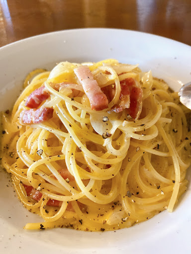 カルボナーラはもったりとしており、量はちょうど良かったです。少し冷めていて、麺と具が硬かったのが少し残念でした。でも、店員さんが優しかったです! 平日でも昼は満席でした。子連れの方や女性の方が 多くおられました。