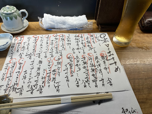 予約しないと入れないかもしれない、地元の人気店。飛び込みの我らはラッキーだったのだろう。それでも平日で30分待った。その間、近くの名店「サンキュー」へ。 サンキューで一杯やっていたところに、「ご用意ができました。」と電話が入り、急いで向かう。 入り口の間口を見て狭いのかなと思ったら、奥行きが深く、どんどん奥へ。個室へ案内される。なかなか感じ良い。