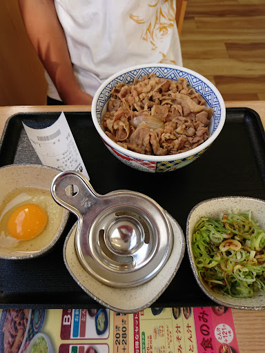 Read moreお昼ご飯に何を食べるか考えながら走っていると、ちょうど交差点付近に「吉野家」が見え、信号待ちのあいだ同行者と協議をし、直行❗️ 11時過ぎなのに車が結構とまっていたので逆に座れるか心配だったけど、何とか座れた。 店員さんの声かけもよく、直ぐに注文を聞きに来た。 旗が立っていた「牛すき鍋御膳」。 同行者は、スパイシーカレーと隣に牛丼の具が乗っているメニューとポテトサラダ。 直ぐに「牛すき鍋御膳」がきてみると、鍋の下には加熱の燃料も付いており、熱々がいただけた。 このお値段ですき焼きが食べられるんだと満足。 しかし、それにも増してスパイシーカレーの香りが勝ってしまい、これも美味しそうだった。 後から入ってきた家族は、テレビの宣伝をみて「牛すき鍋御膳」を食べに来たと話していた。 よく、テレビで見るとボリューム満点で美味しそうだから食べに行くとこれはやはり宣伝用か❗️と思わせるようなものが目の前に届くこともあるけど、今回は熱々といい、味も牛肉の量も満足のいくものだった。 なので口コミに書いてみました😅 なるほどぉ~吉...