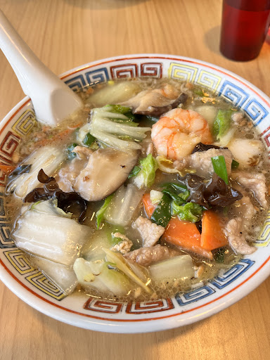 海老うま煮ラーメン 来た時最初間違えたかな?と思った。 海老の他にも色んな具が入ってて。 もっと海老の味を楽しみたかったけど 他の具材が邪魔してる感じ。1300円くらいしたからこれだったら五目ラーメンでいいと思った。