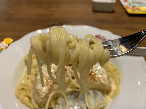 パスタ自体は相変わらずフツー。 カルボというか、ホワイトソースとチーズをミックスしたようなソース。 もうちょいブラックペッパーが欲しいな。 ベーコン美味しいけど、しょっぱいので、パスタと一緒に食べるとちょうどいいかな。