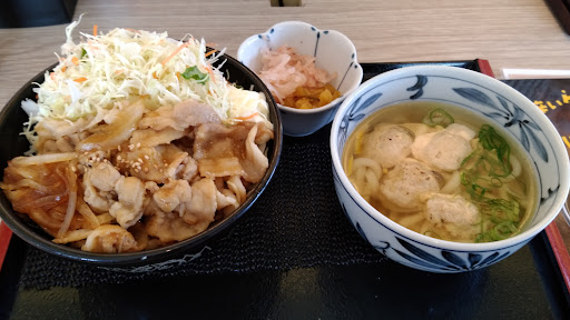 Read more2023.11.8訪問! 生姜焼き丼鶏つくね小うどんセット大盛り+季節の漬物 を頂きました。 味は?普通に美味しいです。 生姜焼き丼。生姜の風味はあまり感じません。肉もそれなりかな?特盛りにしなくて良かった。 鶏つくね小うどん。うどんは普通に美味しいです。鶏つくねが、あまり美味しくありません。形状が球体(団子状態)ではなく、ラグビーボールを半分にしたような状態でした。調理時間とかの関係だと思いますが、風味が抜けていました。 季節の漬物は、とても美味しいです。 久しぶりに寄ったら、配膳ロボットが、導入されていました。伊豆も都会になった? 朝の10:30オーブンなので、早い時間からかつ丼が食べたい時に、重宝です。 お昼はとても混んでいます。 店内飲食と、テイク...