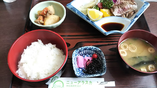 Read more福山市無料バス期間に油木迄行きました 神石牛が食べたくニューアラスカへ行き ステーキ定食と神雷の燗酒を頂き 大変美味しく満足しました 帰りのバス時間が迫り 神雷も購入したいなと呟くと三輪酒店まで車で送ってくださり 親切にしていただ...