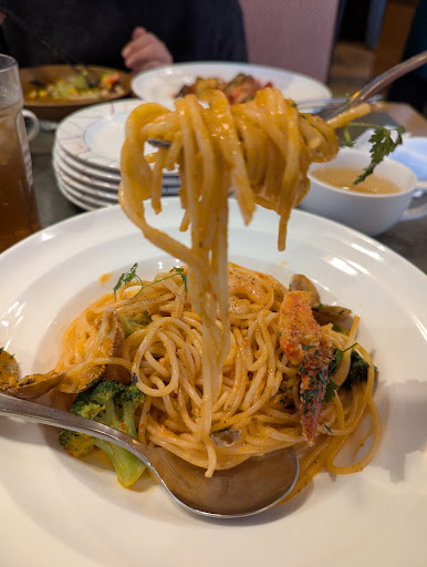 Read more先程、ランチタイムに行かせて頂きました。 サラダバーやドリンクが充実していて良かったです! パスタと同時にみんなでシェアするようにピザも頼んだのですが、ピザだけしばらく来なくて、利用したことないので、どれくらいかかるのか分からず、ずっと待っていました。40分待ってもなかなか来ないのでおかしいと思い、店員さんを呼んで話をしたら最後まで話を聞かないで確認致しますとすぐ去られました。 数分後に、頼んだピザを持ってきてすみません。としか言われなかったので、今できたのかなと思い食べたら、冷めててチーズも固まっていました。なので、作っていたけど持ってき忘れたんだと思います。店員さんから忘れたことなどの説明もされませんでした。言ってくれたのならば、2000円位するものですし冷めていて何分もの間放置してるのであればキャンセルしてその分のお金も出さずに済んだと思います。 非常に残念でした。せっかくの家族との外食なのに嫌な気持ちで終わ...