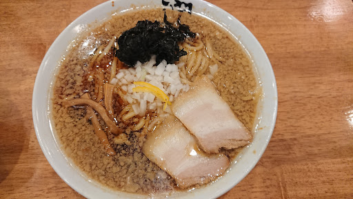 まずは中華そばについて。 濃口醤油に魚介出汁のスープ、多加水ストレート太麺、刻み玉ねぎ、細メンマ、岩のり、背脂、刻みゆず、チャーシューといった内容。 スープは魚介出汁の匂いが強く好みが別れそう。 醤油がかなり濃い。 背脂は濃口醤油が強すぎて正直わからない。 もし背脂をもっと味わいたいなら鬼脂(110円)を別途購入するとよいだろう。 味が濃く塩辛いがコッテリはしておらずサッパリ系である。 岩のりはスープに沈めて柔らかくなってから食べる。 岩のりの食感と風味が楽しいが、岩のり自体も塩気が強いのでこの濃口醤油スープに対してはオーバー過ぎる。 麺については多加水太麺のモチモチ食感で、細めのうどんをイメージする。 チャーシューは硬めの豚バラ焼き肉といった感じ。歯間に詰まる。そして小さい。 今までの上越には無いラーメンであるのは確かだが、これが市民に受け入れられるかは不明。 ハマる人にはハマると思うが私の好みではなかった。