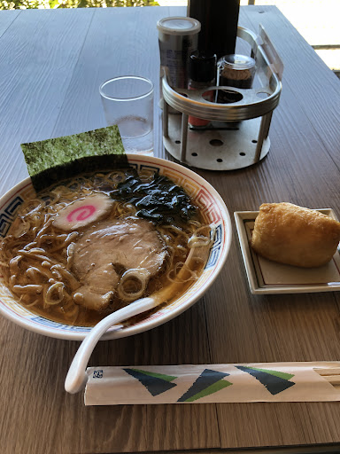 Read more人生ラーメンがお休みだったのでこちらへ 時代遅れ→お父さん、人生ラーメン→息子さんがやられているようですね 店舗前の駐車場がいっぱいだったので200m先の第二駐車場へ✳︎店舗前より駐車場しやすいかも✳︎ 店内入り口の定休日のサインやパート募集の案内が店主の遊び心満載で笑けるw 日曜日のお昼時、1組待ちでした 回転が早くテラス席へご案内 テラス席へ座ると目の前の鬼怒川に壮観!癒される〜 メーンは中華そばと鴨ラーメン、他サイドでポテトフライや手羽めんたい等、メニューはいたってシンプル(メニュー撮影失念…) オーダーは時代遅れに行ったらこれって決めていた中華そば、あとはお稲荷さんを(お稲荷さんはセルフで取るスタイル、本当は芋煮食べたかったけど冬季のみとのことでざんねん) 鬼怒川を眺めしばし待つとようやく待望のラーメンがおいでなすった! ではさっそく食します 中華そばはさっぱりスープでまろやかな仕上がり(スープはどうやら鴨油を使用しているみたい、甘みがあります) 麺は中細麺、めちゃくちゃ好み!おいしいです! メンマは細切りで食べやすく、チャーシューもほろほろやわらか〜歯がいらないくらいwぺろっと完食 お稲荷さんは昔懐かしい素朴なお味 こちらも完食 真夏の暑い日に熱いものを食す、これぞラーメンの醍醐味⭐︎ ごちそうさまでした 次回は芋煮...