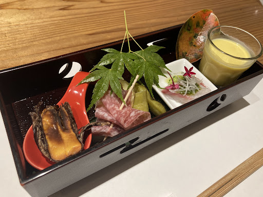 右から ○かぼちゃの冷静スープ →美味しくて一気にこの世界にもってかれる✨ ○鯛のカルパッチョ →エディブルフラワー(食べれるお花)が可愛い💕 オリーブオイルが美味しい… 全然ちゃう。 ○ミラノサラミ →えぇサラミやってすぐ分かる✨ ○フランス産白カビのチーズバケットといちじくジャム →白カビ美味しい。も〜!素材がイチイチ美味しいっ! めっちゃ厳選して選ばはったのがよく分かります。 ○栗の素揚げ →皮も食べれる❗️😳 チップスみたい。 しょっぱい、けど中身は甘いの甘辛ブランコ✨ 面白くて美味しい〜✨