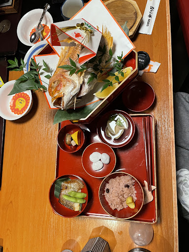 お食い初めのセットは、お膳と祝い鯛を注文。お膳は、栗入りお赤飯、むつの西京焼き、あさりのお吸い物など。儀式のあとは、みんなで美味しくいただきました。