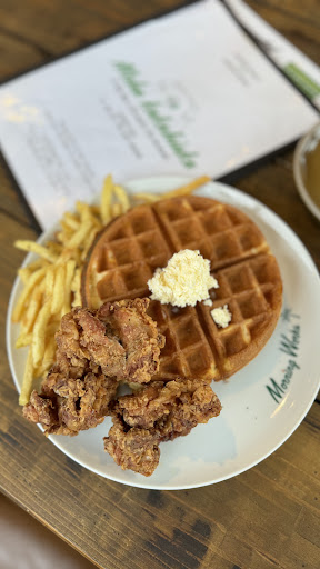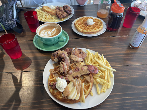 OK. It is a breakfast place really. I will talk to the waffles, pancakes, eggs benedict, and the fried chicken. I will mention the poke bowl and the coffee too.