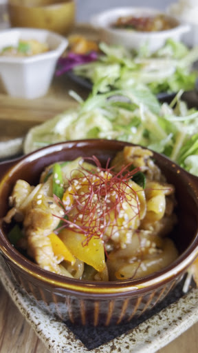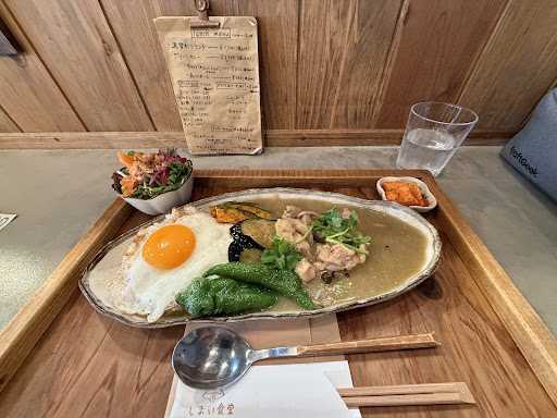 ◆週替わりランチ 税込 1,300円 お盆の上は少しずつ盛りだくさんで賑やか! タイ風焼豚、とうもろこし&蓮根の天ぷら、トムヤムポテトサラダ、茄子の揚げ浸し、 冷奴オクラ乗せ、ゴーヤのカレー風ピクルス、ご飯、味噌汁。 肉から頂くとめっちゃ柔らかくて味付けも良くてこりゃウマー! 硬い肉かな?と思っていたから、あまりにも柔らかくて味付けも文句なくて衝撃でした。 ゴーヤはあまり好きじゃないけど、このピクルスは嫌な苦さが軽減されてこれなら食べれる、いや美味しい♪ ポテサラはちょい辛でトムヤムクンの香りも楽しめてめっちゃ良い^ - ^ 天ぷらは噛んだら良い音が鳴るほどサクサクで、とうもろこしも蓮根も大好きだから最高! 他も全て美味しくて、こんなに自分の舌にぴたっ!とハマる料理はなかなかお目にかかれない。 これはちょっと好みじゃないなって料理は1品も無くて、全てが唸る美味しさだから感動した。