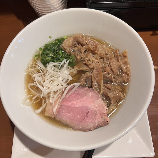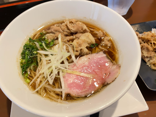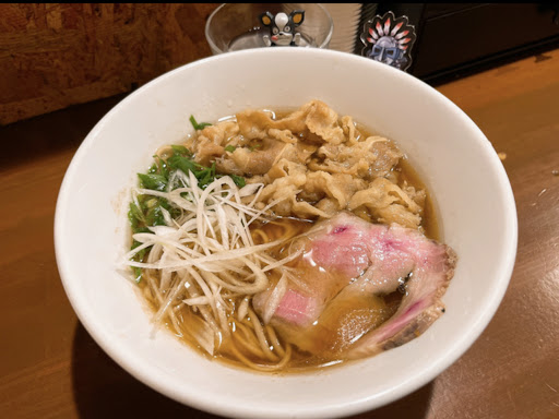 牛丼の肉の様に味付けされたお肉と美しい肩ロースのレアチャーシュー、青と白2種のネギが盛られた澄んだ醤油スープに全粒粉中細麺。