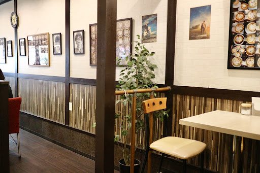 壁にはマスターのラテアートの写真や有名人を描いた鉛筆画がズラリ。