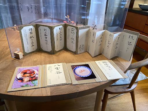 抹茶、珈琲、加賀紅茶、スリランカ紅茶が定番4種、季節のおすすめで台湾茶や煎茶、棒茶等が4種。 おやつはお上品なサイズのロールケーキや上生菓子で、スイーツを楽しむというよりはお茶をメインに楽しみたい方向けの茶房。