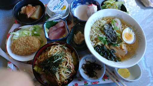 Read more11:00お昼休み行きました。 メンズセット頼みました。品数半端なく感激してしまいました。この日は肉じゃが クリームコロッケ サラダ マグロの刺身 ラジウム卵 インゲンの炒め物 焼売 ヨーグルト 肉丼 ラーメン ラーメン熱々で美味しかったです。肉丼お肉ジューシー 肉じゃがも美味しかった。コスパ最高!900円 レディースセットは肉丼じゃなくて 鮭丼 シラスと白髪ネギ のトッピングもされて...