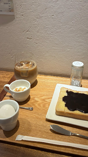 程なくマスターさんが木のトレーにモーニング一式運んできました。 チョコレートトースト、サクサクでチョコレートたっぷりでものすごいうまい! アイスカフェラテもなんだか不思議に香ばしくて、とても好きな味わい。 ...