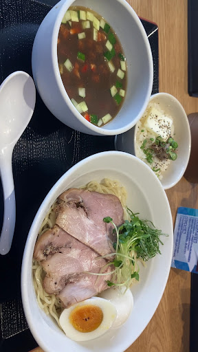 醤油は香ばしい😍 初めてなのに落ち着く味わい。 レアチャーシューも食べやすいですね。 秘伝の薬味入れるとピリっと辛味も加わり味変。 でも個人的には昆布だし効いた『まろ酢』がさっぱり。 モダン塩、 胡椒と花椒(ホアジャン)かな? 更にレモン絞ったら驚くほど爽やかに味変。 900円(税込)と 頑張っている値段設定ですね🥰 もうひとつ、煮干しもあったので、 次、頼んでみようと思いました。 美味しかったです。 追記: 2024年8月に伺いました。 無料誌『シティプレス』に掲載されてて、 クーポンもあったので伺いました😄 『冷製煮干しつけ麺』と『アンチョビ飯』を注文。 クーポンで半熟塩玉子が付くのは嬉しい☺️ 『冷製煮干しつけ麺』 麺はストレート細麺。 上品なお出汁と 敢えて煮干し粉と言いますが、 舌に残る感じは『煮干し粉』のコラボが絶妙。 最初は煮干しの香りがきついかなと思いましたが、 最初の一瞬だけでした。 冷えた細麺に絡むつけ汁の 旨味の大波🌊が口の中で 押し寄せる感じ❗️ 刻んだきゅうり、パプリカは なかなか一緒に口に運べないので、 後から加える感じですが、 シャキシャキ食感が爽やかな演出をします😄 トッピングの大葉で更なる爽快感と、 かいわれ大根の苦味がまたまた合います。 加えてデカいチャーシューで ボリューム感あります。 玉子もつけ汁を潜らせたら 黄身の濃厚に旨味がプラスされて 美味しさ増し増し😋 飽きさせない工夫がされてますね❗️ カタクチイワシのアンチョビ飯、 バターと最初で均一に混ぜてから ご飯🍚と頂きましたら、 良い感じ❤️ 癖のある旨味にバターの香り、塩味、 旨味の相乗効果でヤバ美味💕 とてもバランス良くまとまっている組み合わせで堪能させて頂きました😊 追記: 2024年8月末の周年祭に伺いました。 台風🌀の影響で交通機関が軒並み運休の中、 熱心なファンが開店前で行列を成してました😳 ギリギリ8番目で一巡目に入れました😊 もちろん皆さん目的は『鯛ラーメン』 鯛の頭をバーナーで炙っているのをインスタで見ていたので、 めっちゃ期待してました❣️ 中華そばのイメージが強いので、 魚系だけに透き通ったスープかと思いきや、 クリーミーな見た目😄 一口スープを頂くと… かなりの塩味でびっくり🫢 あっさり系と思い込んでいたから余計にビックリ😂 かなり塩辛い感じでした。 あまり濃い味が得意でない私にはちょっとキツかったです。 鯛の出汁の風味も先に味覚の塩味が顔を出してきて、 せっかくの鯛の風味がわかりにくい😭 トッピングの卵や、柚皮皮、大葉でも塩味の強さは変わらず、 目の前にあった、昆布を漬け込んだ『まろ酢』をかけたら酸味で和らぎました。 鯛を贅沢に使った分、塩味が出すぎたのかなぁ🤣 普段から濃い味が好きな方はめっちゃ美味しいと思います。 普段から塩分を気にされてる方や、 薄味が好みの...