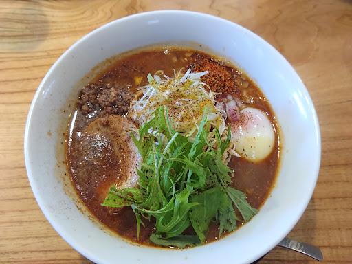 Read more座席は3人がけ(仕切り有)×対面2列の6人分くらい。ラーメンセットを注文。麺は中太ちぢれ麺でスープとよく絡みもちもち美味しい。豚ミンチは優しい甘さで味噌の辛みとよく合っている。チャーシューは味付けが普通だがやや厚めで食べ応えがある。ヤングコーンは甘さ要員かな?スープについては、魚介感はあまり感じないが味噌の濃さがほどよくマイルドで甘辛くてとても麺と合った。味噌がうまい。ただし、完麺後の追い飯に対してはやや弱く感じたので、追い飯時は卓上のチーズを遠慮なく多めにぶっかけて食べた方がいいと思う。追い飯の頃になるとスープに入っていた玉ねぎが甘く柔らかくなりよい仕事をしていた。卓上にはあおさもあり、かけてみたが量が少なかったのか変化がよくわからなかった。水はセルフ方式でクリクラの水が飲める。入り口から見て左列側の奥に冷風機があるので、店内入って左端に立っているととても涼める。トイレは不明。混雑時は店外横のテント下で待つので昼間は覚悟して待つこと。店前にギリ...