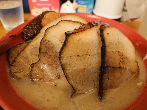 ラーメン王で上位だったので期待して家族4人で行きました! 1時過ぎくらいで席も空いておりすんなり案内されました。メニューに替え玉の記載がありましたが大盛の記載が無く、注文時女性店員さんに「大盛ってないんですか?」と聞くと「替え玉って書いてありますよね!こちらを注文してください」と強めの口調で言われ気分を悪くしました。 豪麺2つと赤玉1つ注文し、男性店員さんが先にラーメンを2つ運んできてくれましたが…無言でテーブルに置かれ、無言で去りました。見た目で豪麺だろうとわかりましたが、せめてラーメンの種類を言ってテーブルに置いていただきたかったです。