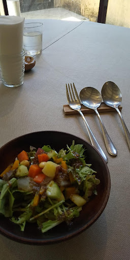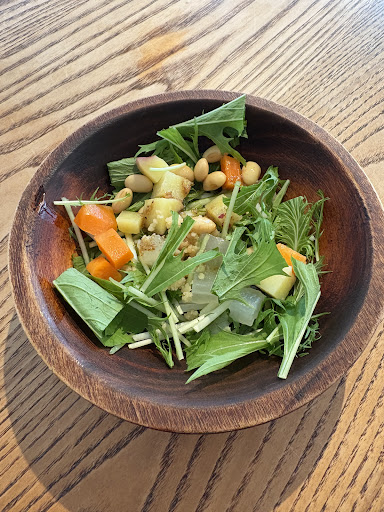 期間限定の生パスタセットを注文しました。(パスタ、サラダ、パン、スープ、デザート、ドリンク) サラダ🥗は、水菜をベースに大根にんじん大豆がトッピングされ、手作りドレッシングがかけてあり食べやすいです。 ごぼうのスープはごぼうの香りがして素材の味を生かしていてさっぱりといただけます。クルミのパンは小麦粉の味が感じられるパンです。