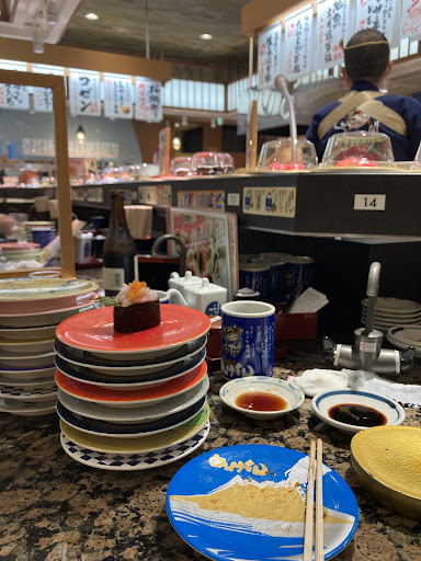 What made it great: • The sushi was incredibly fresh with a wide variety, from seared salmon and tuna to sweet shrimp and scallops. Everything was flavorful and well-prepared. • The two-tier conveyor system was fun and efficient—sushi ran on the top belt, and sauces and cups on the lower belt. • The place was lively and welcoming, with cheerful greetings from the staff and a buzzing vibe that added to the experience. • The prices were very reasonable considering the quality. It felt like having top-tier sushi without the hefty price tag.
