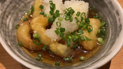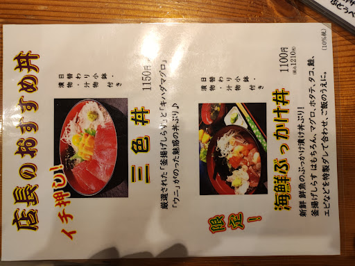 Basically a seafood restaurant with a selection of shochu bottles at reasonable prices, but on some weekends, live music show starts in a cosy friendly atmosphere. (The master plays violin ! ) Lunchtime bowl of fresh sashimi slices is also enjoyable. In particular, a bowl of whitebait fish(Shirasu ) is nice, but westerners might not be accustomed to eating such small fish in a fresh state. The secret is that this restaurant is owned by a fishing company in Kushikino, so the fish are fresh and served...