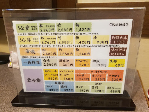 鰻魚份量依以下分 Size of unagi as follow: 松(matsu, pine) deluxe with nearly whole eel, eel liver sauce is spreaded onto the eel without charge. 竹(ta-ke, bamboo) superior with more than a half 梅(ume, plum) normal with nearly a half 小(small…) just a portion of unagi 松 27xx 竹 20xx 梅 14xx 小 9xx yen円 價格隨時變動,請自行調節。 Price is subjected to change, please self adjusted. 飯量基本上全部一樣,如要加飯請大盛。 All unagi rice sets have same amount of rice, please order big bowl for more rice. 大盛(o-mori, big...