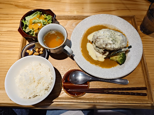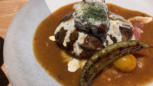2024年11月に伺いました。 予約無しで伺いましたが、 早い時間に伺った事もあり、 席に座れました😅 提示された席を変えたいという要望も 対応してくださり、 ありがたかったです。 店内は狭いながらも席数は カウンターも含めて以外とある感じ。 注文はスマホからで、今時ですね。 母と伺いましたが高齢で注文は私が😅 年配の方は大丈夫かなぁ… でもそんな心配は無用なくらい、 めっちゃ丁寧な接客を ご夫妻がされました。 説明を丁寧にしてくださいます👍 リビング新聞のクーポンを使って、 飲み物を注文。 選べる五つのうちの1番下の『自家製レモネードソーダ』をお願いしたら、 『主人の手作りのレモネード』なんて表現を奥様が🩷 『主人』なんて言葉をサラッと使う感じ、 久しぶりに聞きました💕 『下に沈んでいるのでかき混ぜてお飲みください』と笑顔で☺️ 『ナントロシチューハンバーグ』と『和風ハンバーグ』を注文。 ご飯大盛も同じ金額はありがたい🙏 待っている間、 ご主人のハンバーグの空気抜きの 『パンパン』する音が 心地良く店内に響きます。 いかにも手作りって感じが 余計に期待しちゃいます🤤 見栄えからして美味しそう😋 サラダ🥗のドレッシングがまず美味い‼️ 『ナントロシチューハンバーグ』 乗っかっているナントロ、 もっと欲しい😄 ナントロ追加したいくらい柔らかで 沁みてるし、旨味も肉の甘味も感じれました。 肝心のハンバーグ、 噛み応えあって、 噛むほどに旨味が広がり、 シチューと合わせると美味しさの幅が更に広がる良い感じ❤️ バケットで掬って残さず食べてしまいました😃 『和風ハンバーグ』 大根おろしとの相性ナイス👍 定番に昇格したのも頷ける食べやすさ。 年配の母でもペロリ😋と食べられちゃいました。 これはご飯🍚との相性が良いですね❣️ お腹に余裕があれば➕300円のデザートも食べたかったんですが、 もうお腹いっぱい😅 最後は厨房のご主人が ドア🚪までお見送りしてくださいました。 とっても素敵なご夫婦💓 またお会いしたいと思いました😄 追記: 2025年3月の夕方に伺いました。 当日予約がホットペッパーグルメで 出来たので伺いました。 肉寿司がテレビに出ていたので、 楽しみでした。 『厳選黒毛和牛炙り握り寿司〜いくらのせ〜』 味覚的に言うと『いくら』の方が主役な感じでした。 さっぱりと頂けたのは好印象。 『ギフエロイベリコ生ハムのリエット』 生ハムの価値が高いからか、 値段に対しての量が ちょっと足りなく感じてしまいました。 『桜えびのクリームソースパスタ』 彩りも綺麗でした。 味、塩味はお酒に合わしてでしょうか、濃いめです。 最後に『チューリップ』の唐揚げとポテト🍟を頂きましたが、 パスタの時も感じたんですが、 チューリップとポテトの 油が後口に残る感じ。 油のキレがあまり良くない感じでした。 そこがちょっと残念🫤 味はどれも美味しかったので、 次に期待したいです。 『ナントロシチューハンバー...