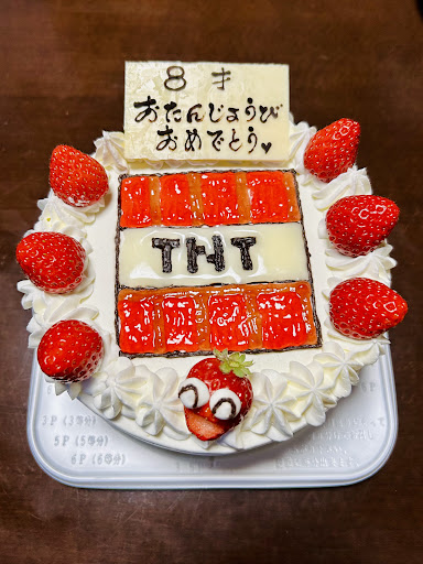 子供が大好きなキャラクターイラストを描いてくれます。子供が大好きなゲーム「マインクラフト」の中で、大好きなキャラクター【クリーパー】と【TNT】なる爆弾のイラストが描かれた作成例がありましたが、いちごが大好きな子供にちなんで、赤を中心とした【TNT】爆弾ケーキにてお願いしています。